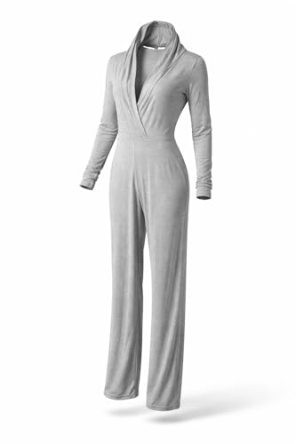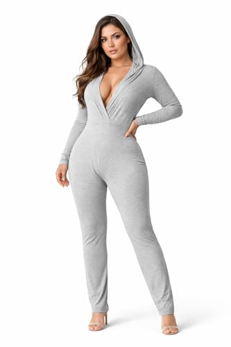 Generic - جمبسوت نسائي بقبعة، رمادي، بياقة V عميقة، بأكمام طويلة، قماش مطاطي ناعم، للارتداء اليومي والخروجات Grey Hooded Deep V-Neck Jumpsuit for Women – Long Sleeve Stretchy Wrap Front Bodycon One-Piece