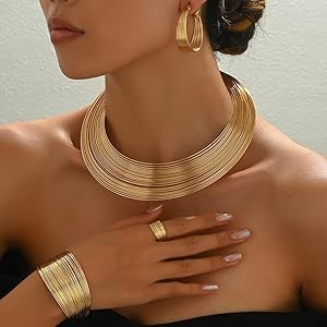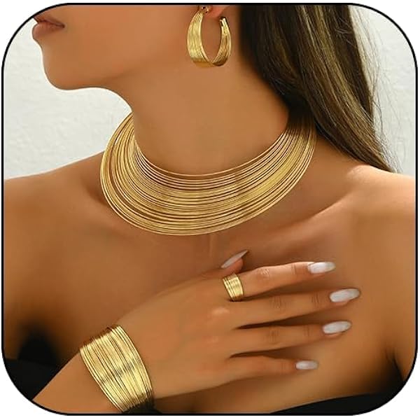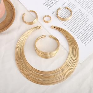Generic - طقم مجوهرات نسائية من الأسلاك المعدنية متعددة الطبقات، مجموعة مكونة من قلادة وأساور وأقراط وخاتم
