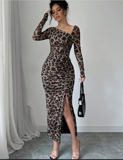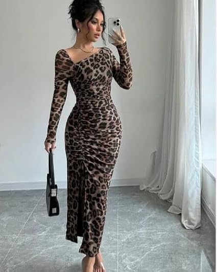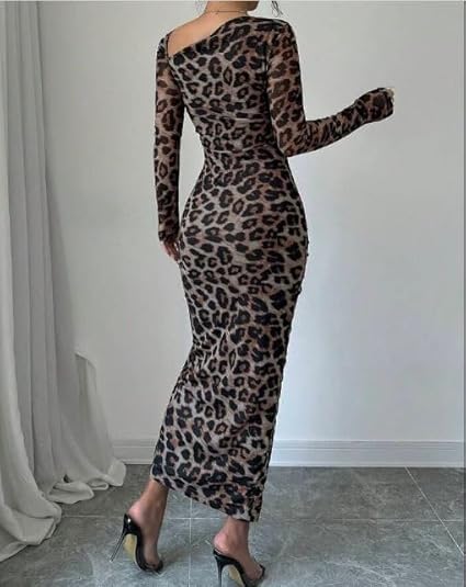 Generic - فستان ماكسي بقصة ضيقة وطبعة جلد الفهد للنساء باكمام طويلة وفتحة جانبية وقبة مربعة