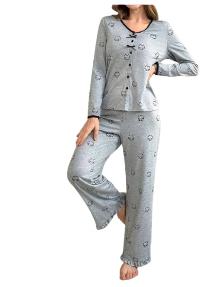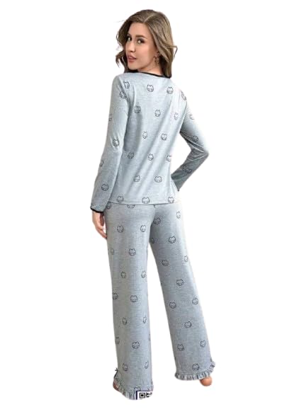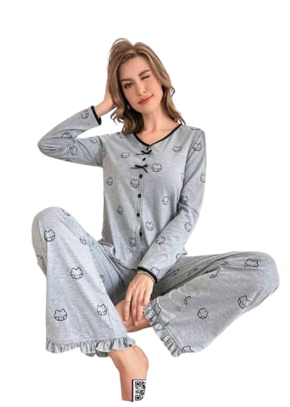 Generic - بيجامة حريمي كوم طويل قطعتين - خامة قطن ليكرا - لون رمادى - مقاس من 60 الي 85 - كود 2465