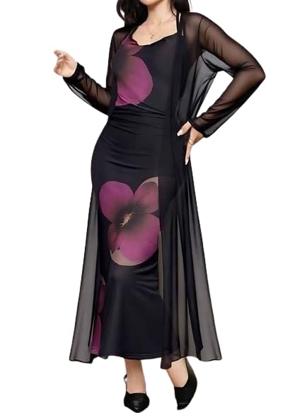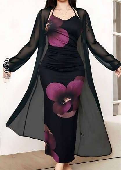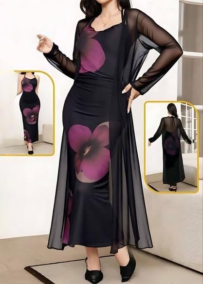 Generic - لانجري طويل قطعتين حريمي – روب تل ناعم + قميص نوم ليكرا زبدة بطباعة ورد – طقم نوم نسائي أنيق مرن – وان سايز يناسب 60-85 كجم