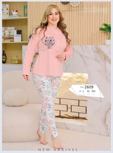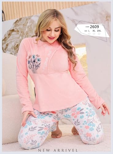 Generic - طقم بيجامة حريمي مكون من قطعتين، تيشيرت مضلع بأكمام طويلة مع تطريز بسيط، وبنطلون مضلع منقوش بزهور ملونة