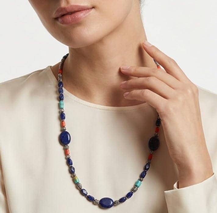 Indian Stones MA - عقد هندي قديم حريمي فاخر من الفضة المخلوطة بالنحاس اقل من العيار مرصع بأحجار طبيعية كريمة من الفيروز ولابس لازولي والمرجان - متعدد الالوان Awd1
