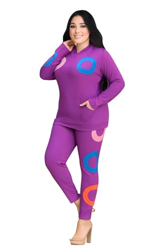 Perfect Fashion - طقم ملابس مريحة رياضية للنساء، أرجواني مع طباعة هندسية، بلوزة بأكمام طويلة وسروال ضيق يناسب وزن حتى 80 كجم، pg14