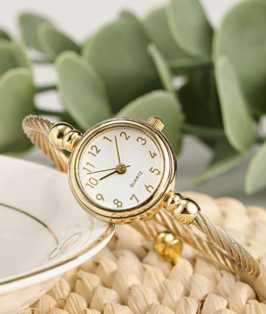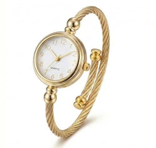 Generic - ساعة بسوار حلقي للنساء، سوار ذهبي ملتوي، مينا ابيض، حركة كوارتز، خرز مزخرف