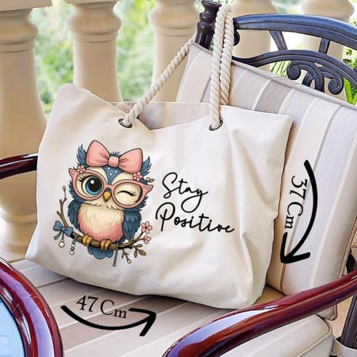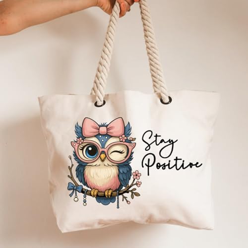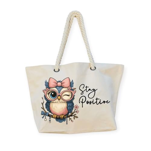 Generic - شنطة شاطئ للنساء، شنطة توت متعددة الاغراض، هدية صيفية، شنطة بحرية، 47 سم × 37 سم، طباعة على جانب واحد، تصميم بومة، ابق ايجابيا، نحن نطبع هديتك