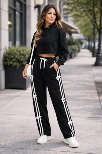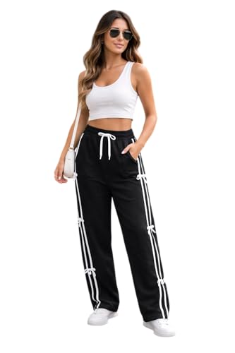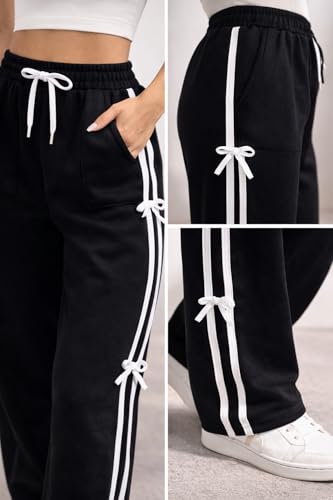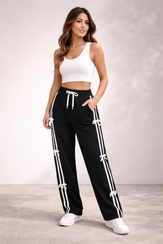 Generic - بنطلون رياضي أسود مصمم بخطوط جانبية باللون الأبيض للنساء، رباط عند الخصر قابل للتعديل، مزود بتفاصيل فيونكة، ملابس كاجوال رياضية، مقاس ميديوم M