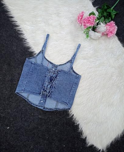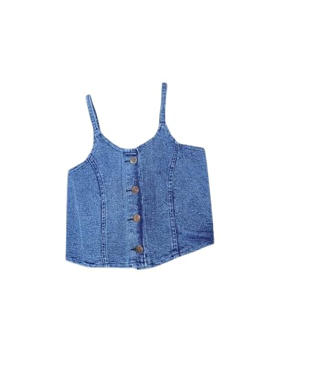 Generic - توب نسائي جينز أزرق بأزرار أمامية، حمالات رفيعة، تصميم قصير