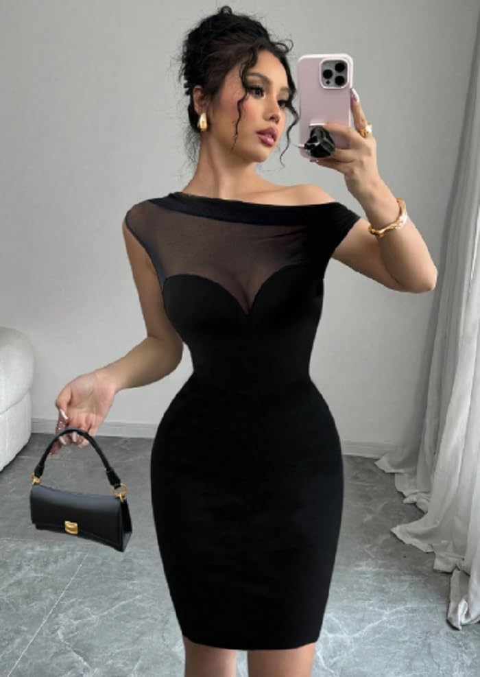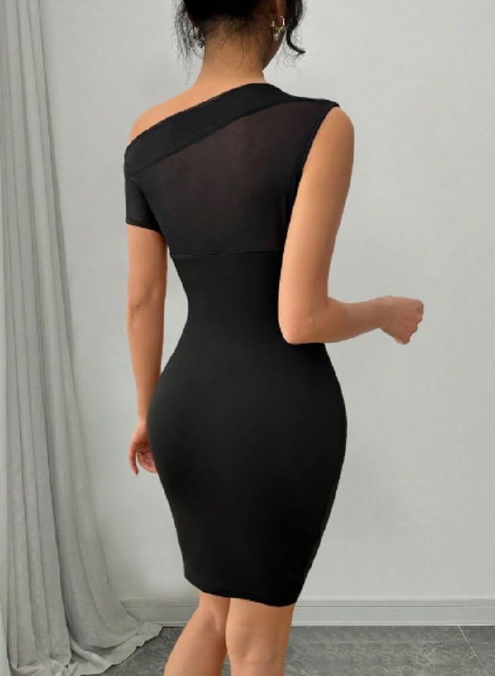 Generic - فستان قصير بودي كون للنساء، بكتف واحد، تصميم شبكي، أسود، كم قصير