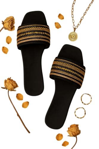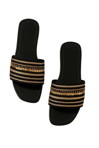 Generic - شبشب بوهيمي للنساء بلون اسود مع ترتر وخطوط ذهبية، مقاس 40