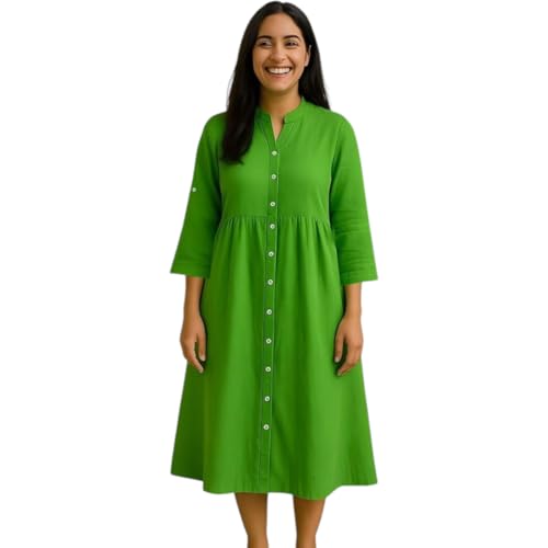 Generic - فستان نسائي بأزرار أمامية، أخضر، بأكمام 3/4، تصميم واسع بطول متوسط تلبيس فضفاض