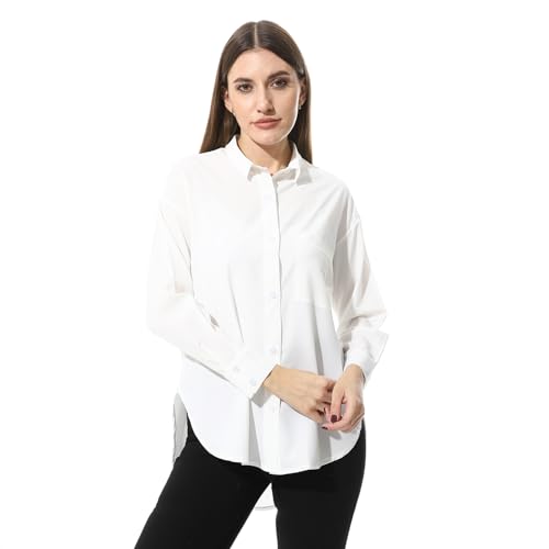 Generic - قميص بازرار واكمام منفوخة للنساء، قطن 100% (اوف وايت، L)