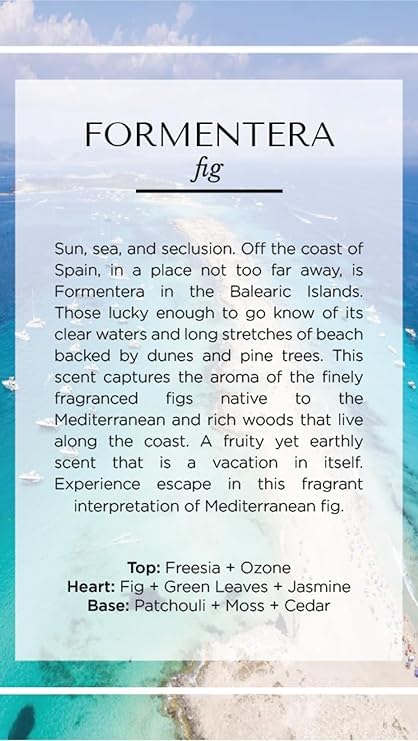- المكونات العليا: الفريزيا والأوزون، الروائح الوسطى: التين والأوراق الخضراء والياسمين، الروائح القاعدية: الباتشولي والطحالب والأرز، خالية من الفثالات والغلوتين والبارابين والكبريتات وشمع البارافين ومزيج شمع جوز الهند والصويا وفتيل القطن، وقت الاحتراق 55 ساعة