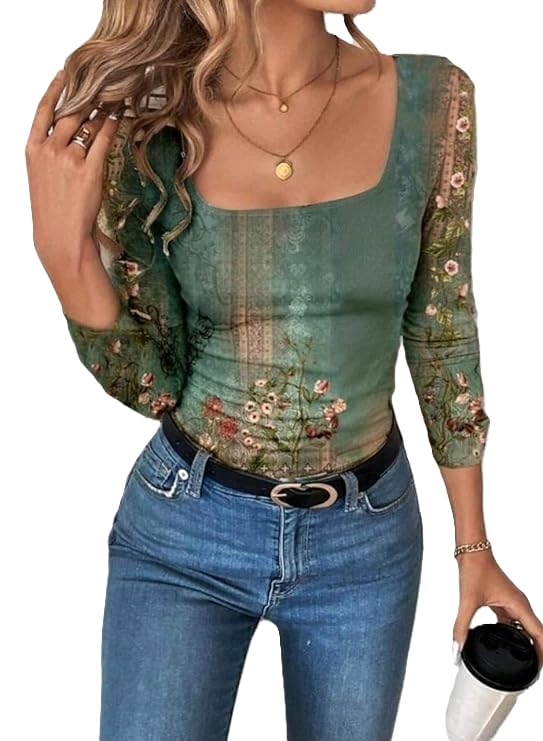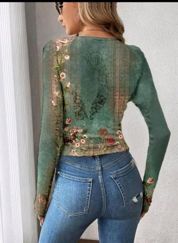 Generic - تيشرت كاجوال بأكمام طويلة ورقبة دائرية ضيقة بنقشة زهور ريترو للنساء، مناسب للخريف والشتاء
