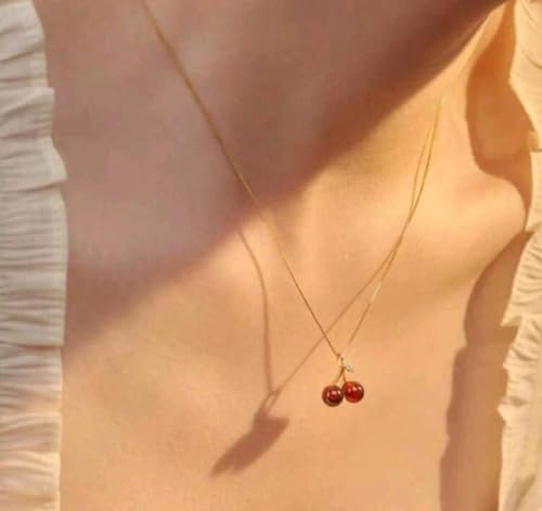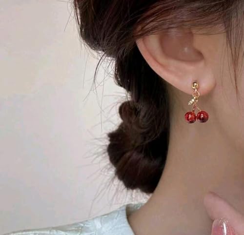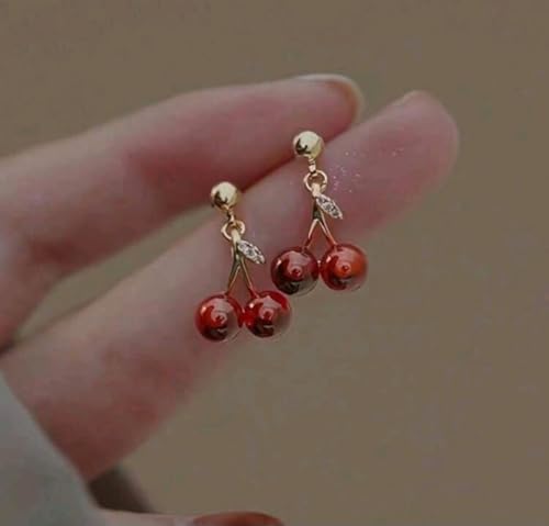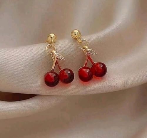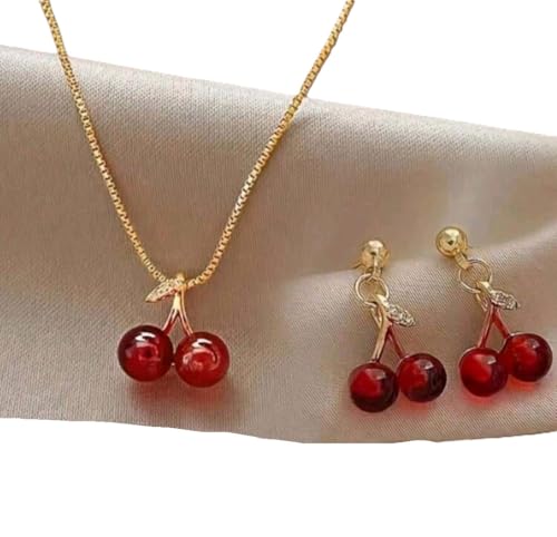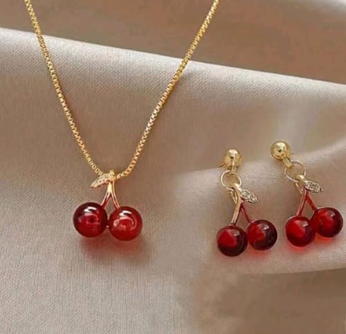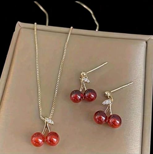 Generic - مجموعة مجوهرات نسائية علي شكل الكرز المكونة من 3 قطع حلق وسلسلة لون الأحجار : أحمر
