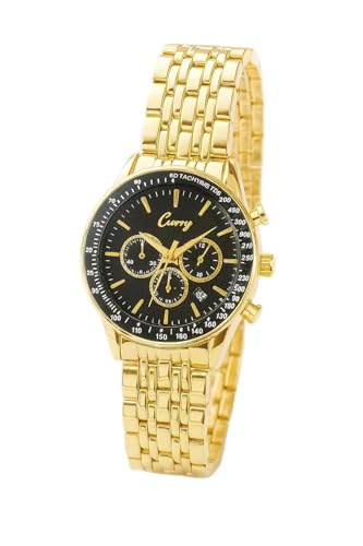 Generic - ساعة نسائية كلاسيكية، ميناء أسود وإطار ذهبي، سوار معدني مطلي بالذهب، مقاومة للماء، مزينة بالكريستال، مع عقارب تناظرية وتقويم