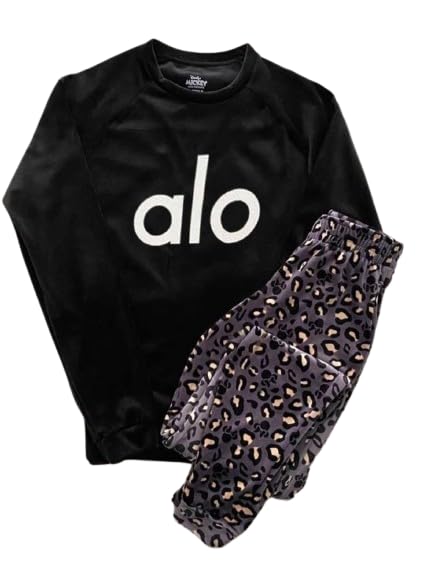 Generic - طقم ملابس نسائي، بلوزة سوداء مع سروال مطبع بنقشة الفهد، قطعتين شتوي