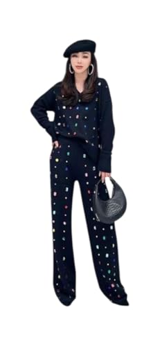 Generic - طقم نسائي بنقاط ملونة، أزرق داكن، بلوزة وبنطلون واسع، ستايل كاجوال