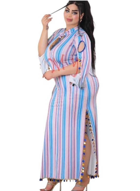 Generic - قفطان نسائي طويل مخطط ملون | فستان سهرة بتطريز لامع وفتحات | تصميم عصري