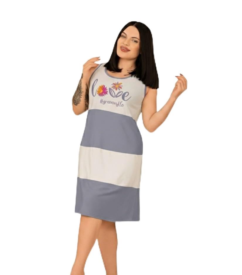 Generic - فستان منزلي نسائي مريح، تصميم مخطط باللون الرمادي والأبيض، مع طباعة زهور، قطعة واحدة