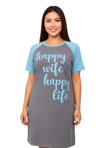 Generic - فستان نوم نسائي مريح، قطن رمادي وأزرق، تصميم عصري مع طباعة نص سعيد