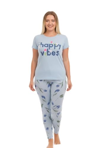 Generic - طقم بيجامة منزلي مريح للنساء، تي شيرت ازرق فاتح مع طباعة هابي فايبس وسروال مورد طقم ملابس نوم عصري