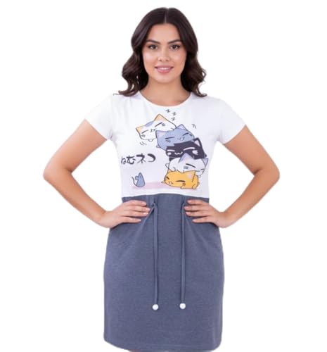 Generic - فستان منزلي قطني نسائي، تصميم كاجوال مع طباعة قطط كرتونية، لون أبيض ورمادي