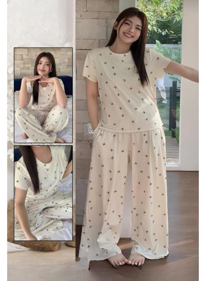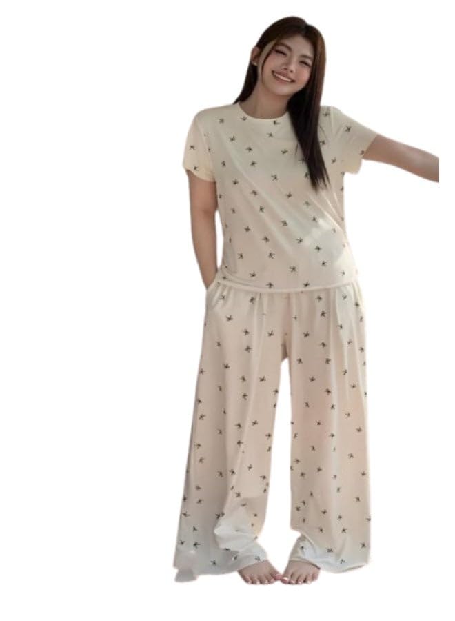 Generic - بيجامة قطن نسائية قطعتين (تيشيرت وبنطلون واسع) - طباعة رقيقة - ملابس نوم مريحة للمنزل