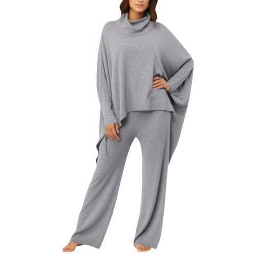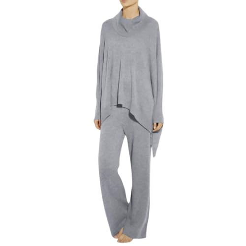 Generic - بيجامة نسائية قطن، طقم بيجاما بياقة عالية، رمادي، بنطلون واسع وبلوزة فضفاضة