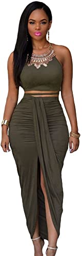 Generic - فستان قطن من قطعتين بجيب علوي للنساء بلون اخضر غامق