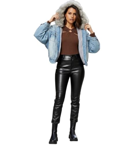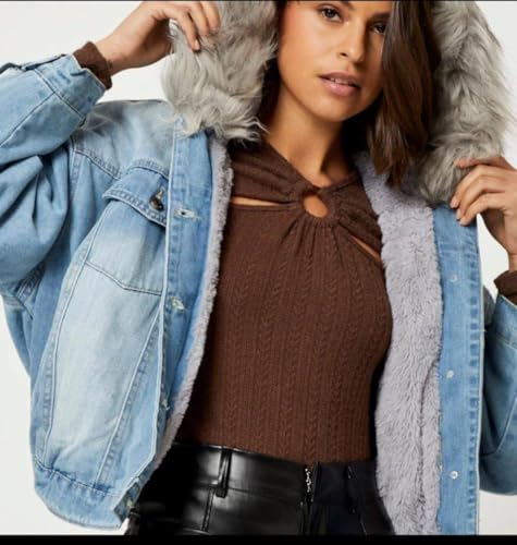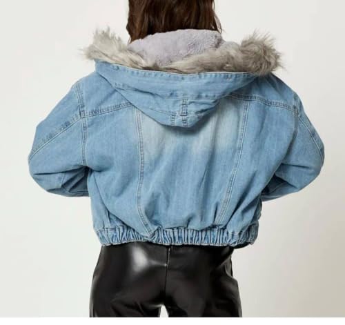 Generic - جاكيت جينز نسائي مبطن بالفرو، جاكت جينز هاي وسط ون سايز يلبس ل 85كبتصميم عصري، لون ازرق فاتح وغامق مناسب للشتاء والخريف