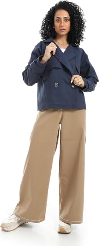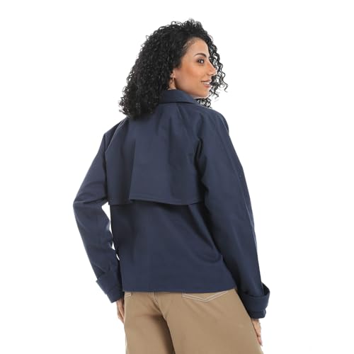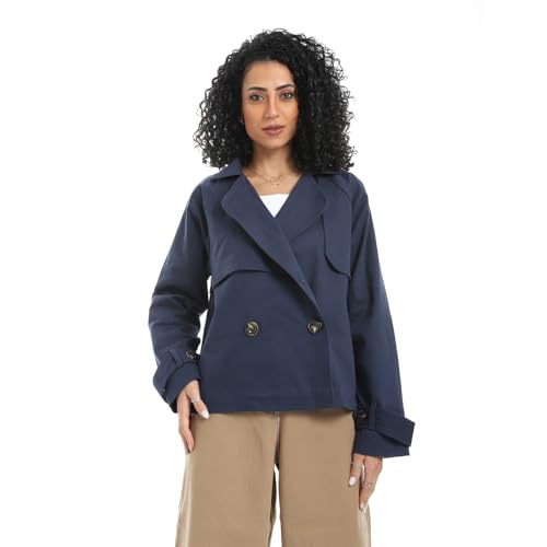 NEVER BASIC - جاكيت ترنش قصير مزدوج الصدر للنساء، ازرق كحلي، ياقة واسعة بطية قلابة، كم طويل