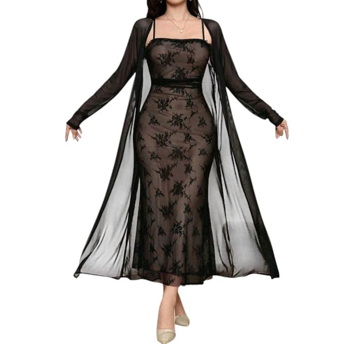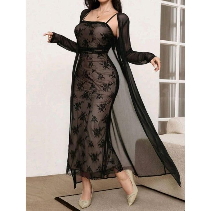 Generic - فستان طويل للكاحل مصنوع من الليس والشيفون برقبة مستقيمة للنساء، قصة فيتد مع كم طويل وحزام قابل للتعديل، لون أسود