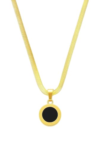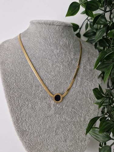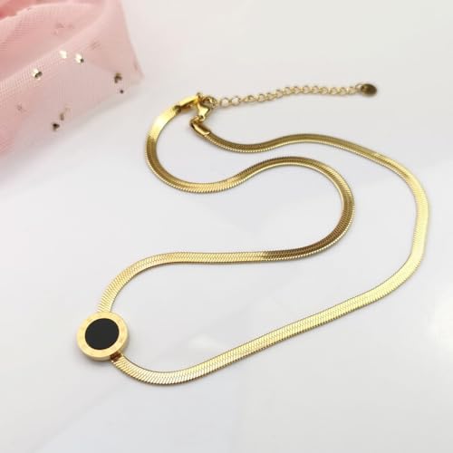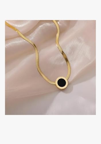 Generic - قلادة نسائية أنيقة، ذهبية اللون، سلسلة معدنية مسطحة مع حلية دائرية سوداء، تصميم عصري للمناسبات اليومية