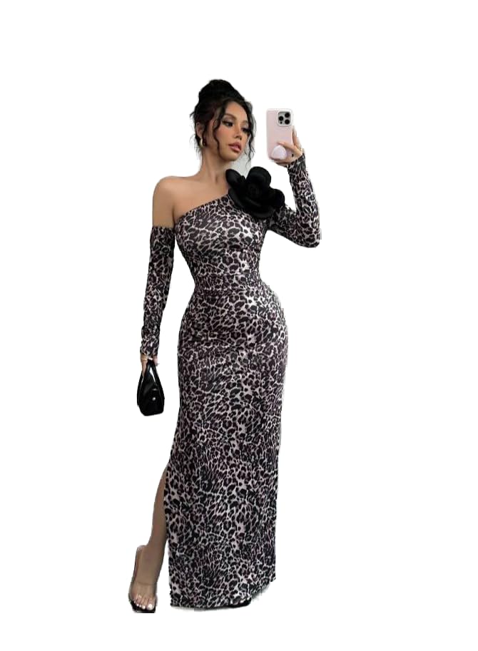 Generic - فستان نسائي انيق محبوك باكمام طويلة مكشوفة الكتفين بتصميم زهور ثلاثية الابعاد مناسب للخريف والشتاء - JP0931LL