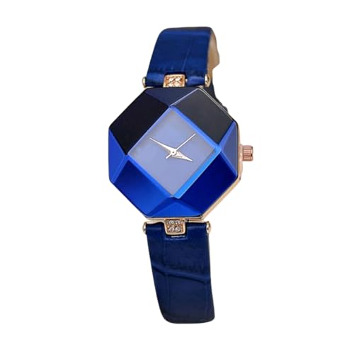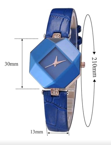 Generic - ساعة يد حريمي أنيقة باللون الأزرق الملكي تصميم هندسي بواجهة كريستال متعددة الجوانب وسوار جلد شيك