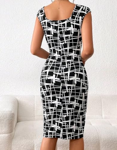 Generic - فستان نسائي أنيق بكم قصير وفتحة رقبة مربعة وطبعة كاملة شكل مربعات أسود وأبيض