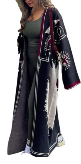 Generic - عباية مطرزة للنساء، اسود بتصميم هندسي متعدد الالوان، كارديجان مفتوح من الامام باكمام طويلة