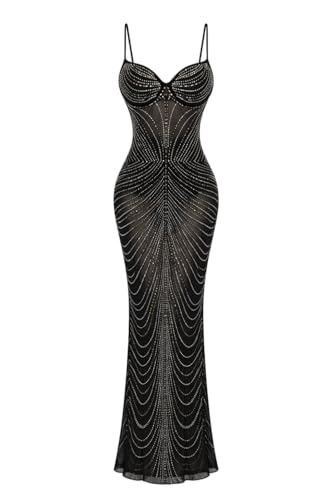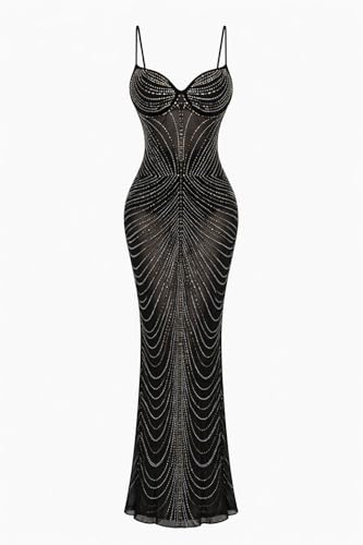 Generic - فستان سهرة نسائي طويل، أسود، مرصع بخطوط لامعة، قصة ضيقة، حمالات رفيعة، تصميم فاخر للمناسبات