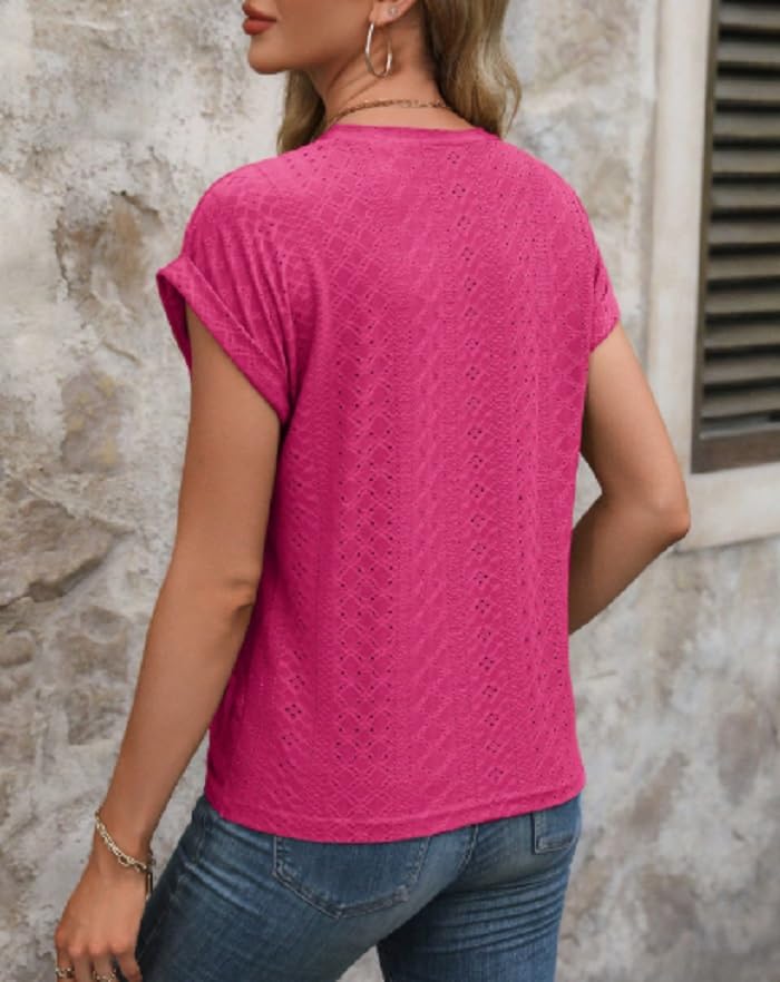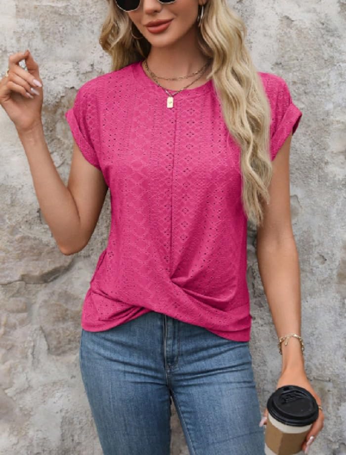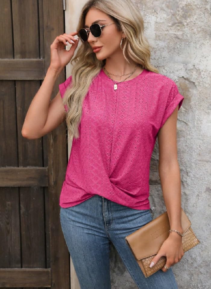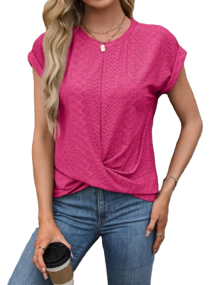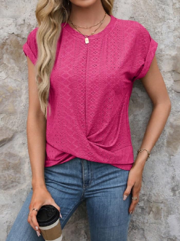 Generic - تي شيرت نسائي مطرز بعروة، تصميم أمامي ملفوف، لون بينك فاقع، كم قصير، قصة فضفاضة
