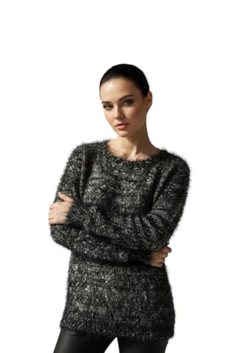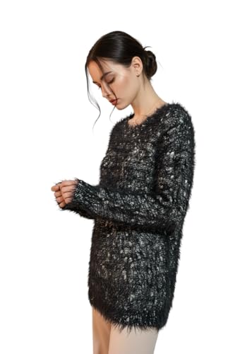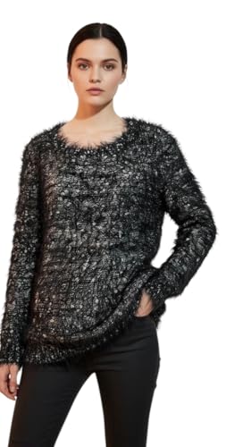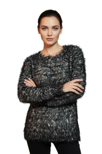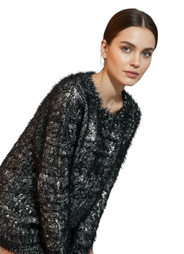Generic - سترة نسائية عصرية من الصوف الناعم، أسود فضي، تصميم فاخر مع نسيج مخملي لامع المقاس لارج