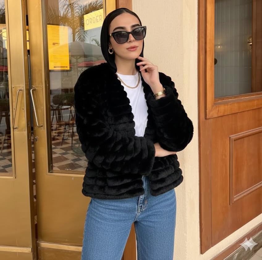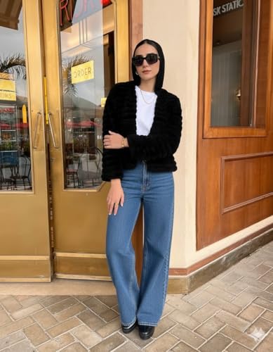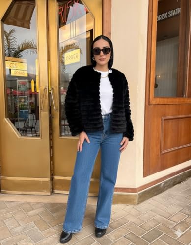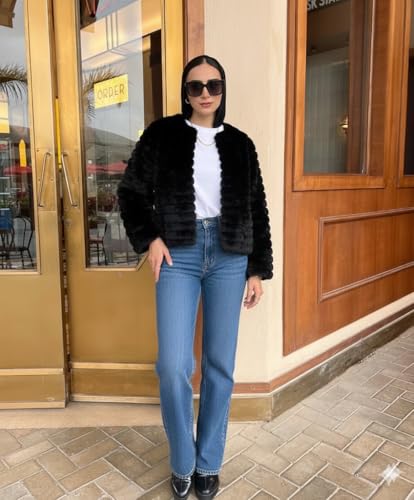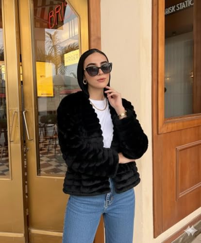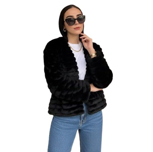 Generic - جاكيت حريمي من الفرو الصناعي، تصميم مضلع منسوج وأكمام طويلة، ملابس خارجية شتوية، أسود