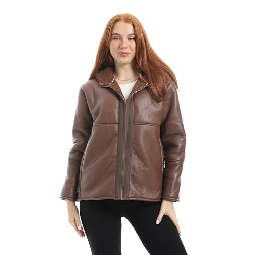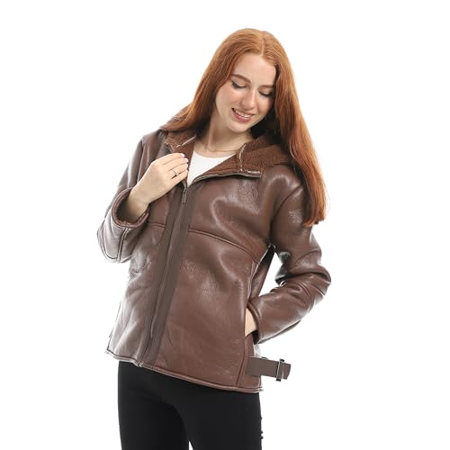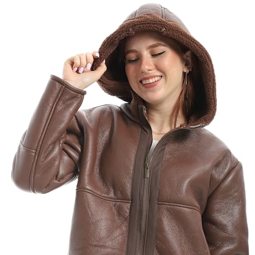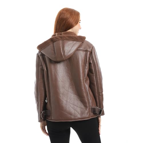 Coctail - جاكيت بغطاء للراس من الجلد الصناعي للنساء بنمط سحاب مع كبوت مبطن شيربا - 17322
