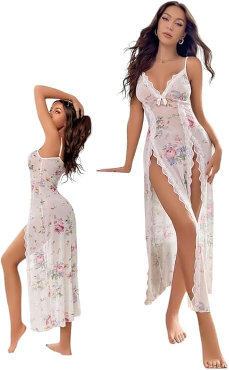 Generic - قميص نوم لانجيري دانتيل مشجر للنساء، أبيض مطبع بزهور وردية، قماش شبكي شفاف، فستان طويل بفتحة طويلة