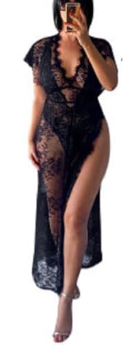 Generic - فستان لانجري ماكسي شفاف من الدانتيل مزين بالزهور للنساء - ملابس نوم شبكية بفتحة رقبة على شكل حرف V - حتى 65 كجم