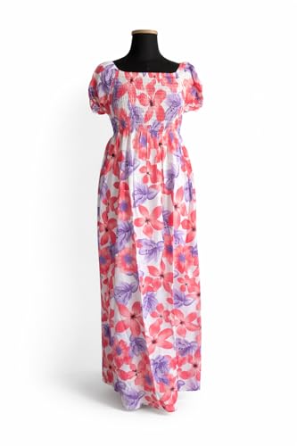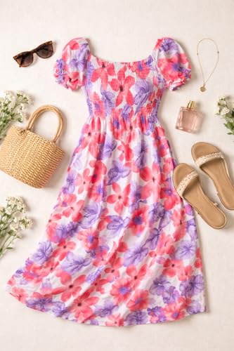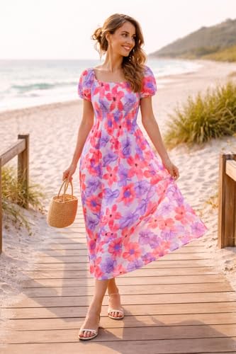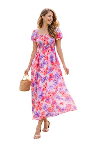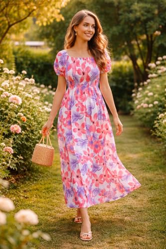 Generic - فستان ماكسي مطبوع عليه زهور واكمام قصيرة وقبة مربعة وخصر مكشكش وزهور بلون بينك وارجواني