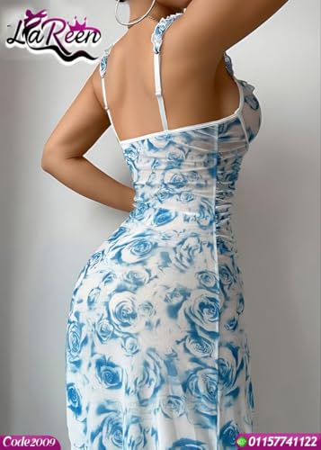 Generic - فستان لانجيري ماكسي بطبعة زهور للنساء، نمط وردي، بودي كون مكشكش، فتحة عالية، بدون اكمام مع اشرطة مكشكشة