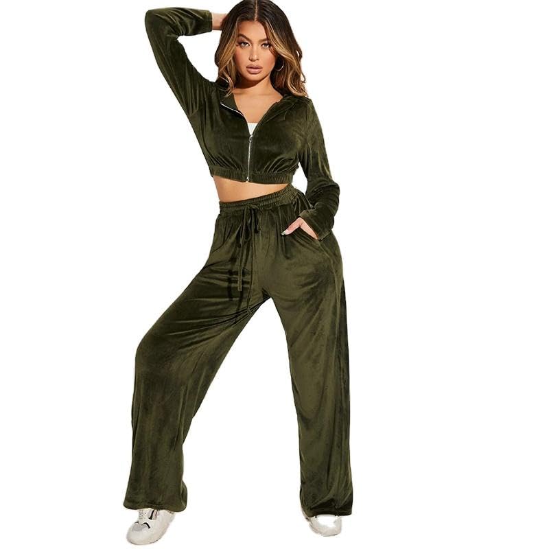 Generic - سويتر بغطاء رأس فلورين للنساء بتصميم بسوستة مع بنطلون عريض بتصميم مطابق يناسب وزن من 60 إلى 80 كيلوجرام، طقم من قطعتين فائق النعومة لراحة يومية، لون زيتوني