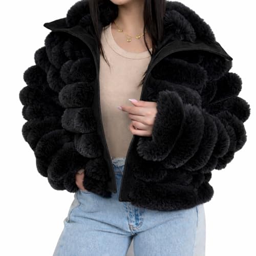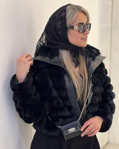Generic - جاكيت فرو نسائي مطعم جلد شتوي قصير وان سايز مناسب حتى 85 كجم (اسود)