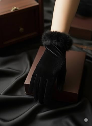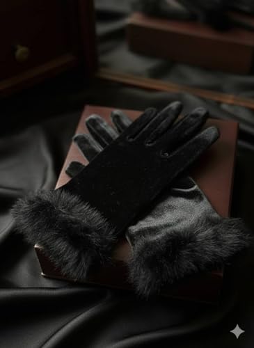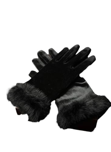 Generic - قفازات نسائية قطيفة سوداء مع فرو، جوانتي حريمي قفازات شتوية دافئة